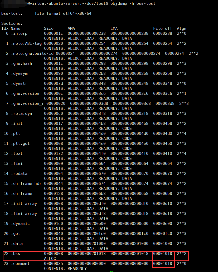 可以看到,虽然.bss段size为8字节,但其file offset与相邻段完全相同。而且还可以看到,.bss段是没有CONTENTS属性的,这就表示它实际上在此文件中不存在内容。