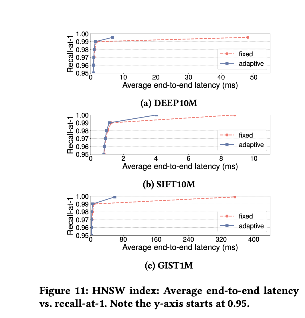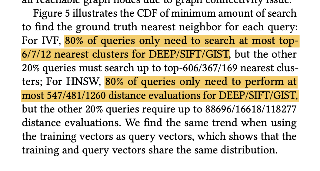 HNSW下:80%的请求需要小于等于 547/481/1260次距离计算(在layer0 扫过这么多点);但长尾的20%却需要 88696/16618/118277(DEEP/SIFT/GIST)